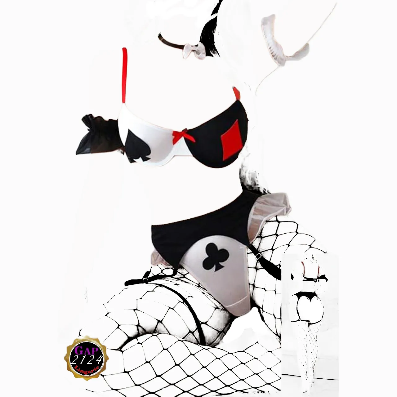 ✔️ سوتین جذاب: طراحی شده با علامتهای خشت و پیک پاسور، کاپها دو رنگ هستند، یک کاپ مشکی و یک کاپ سفید، بندهای سرشانه نیز به رنگ قرمز هستند که تضاد چشمنوازی ایجاد میکند.