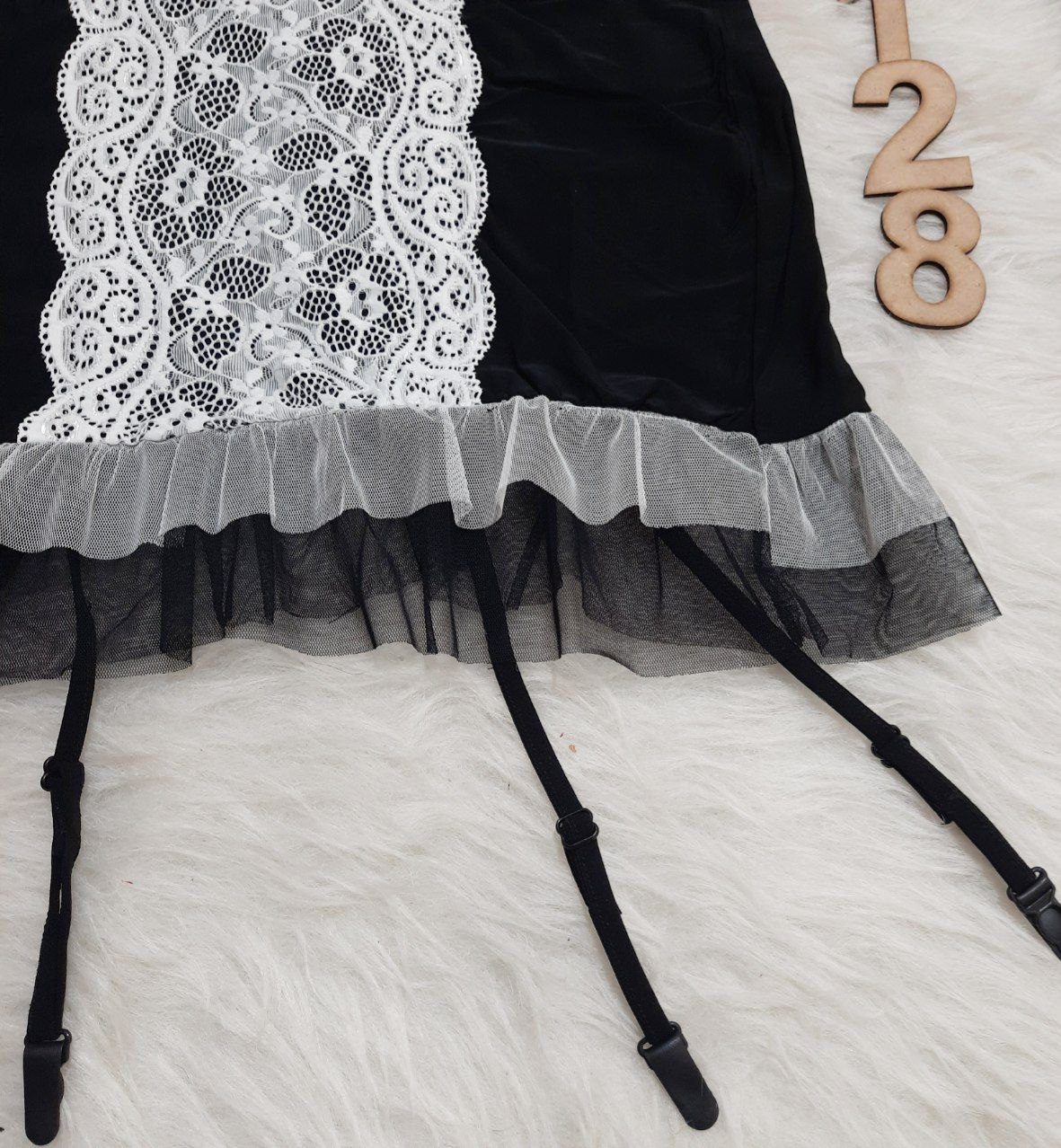 کد 5128 از ترکیب دانتل و ریون مشکی بهره می‌برد. ریزه‌کاری در طراحی این مدل آن را خاص و متفاوت می‌کند. بخش جلو این مدل دانتل کار شده و با یک پیش‌بند زیبا تزیین می‌شود. این مدل تل، گردن‌بند و بند جوراب و جوراب هم دارد که به آن ظاهری مدرن داده و آن را از مدل‌های قدیمی و ساده متمایز می‌کند. این مدل فیری سایز بوده و برای سایز 40 تا 44 مناسب است. اندازه‌ها در ادامه برای بررسی دقیق‌تر نوشته شده است.